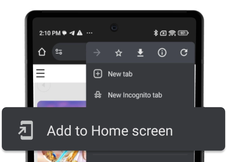 In browser menu press «Add to Home screen»